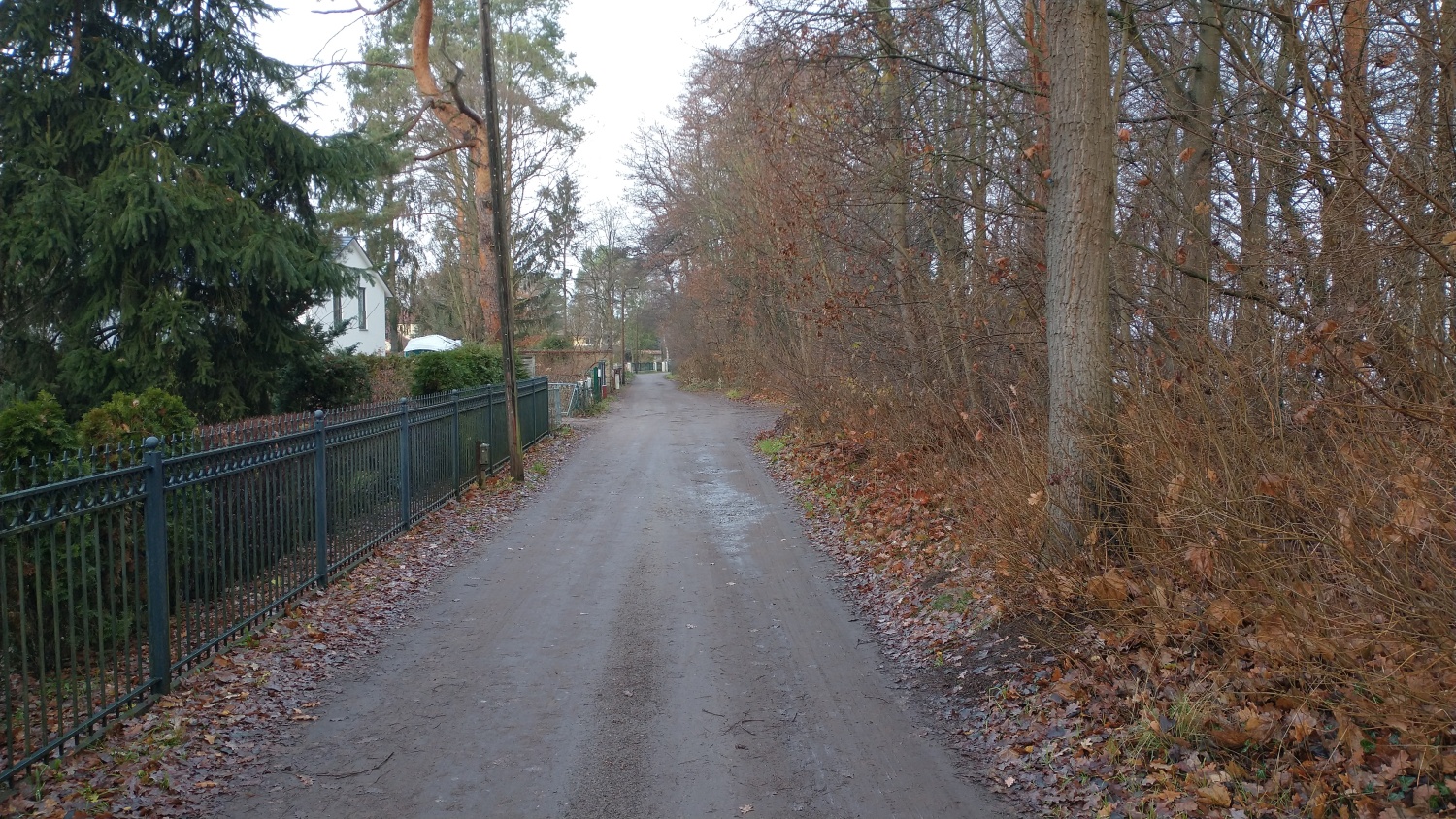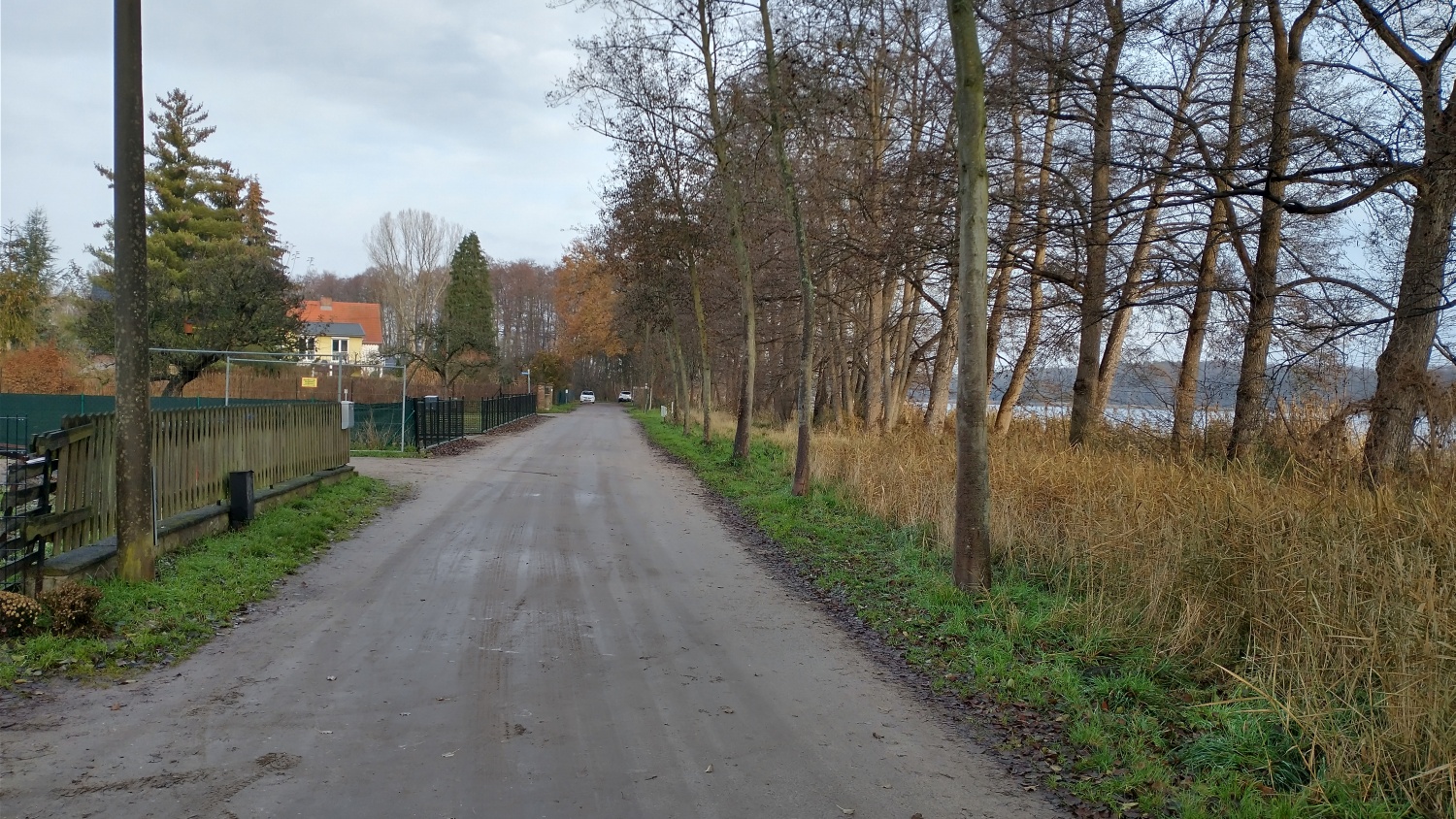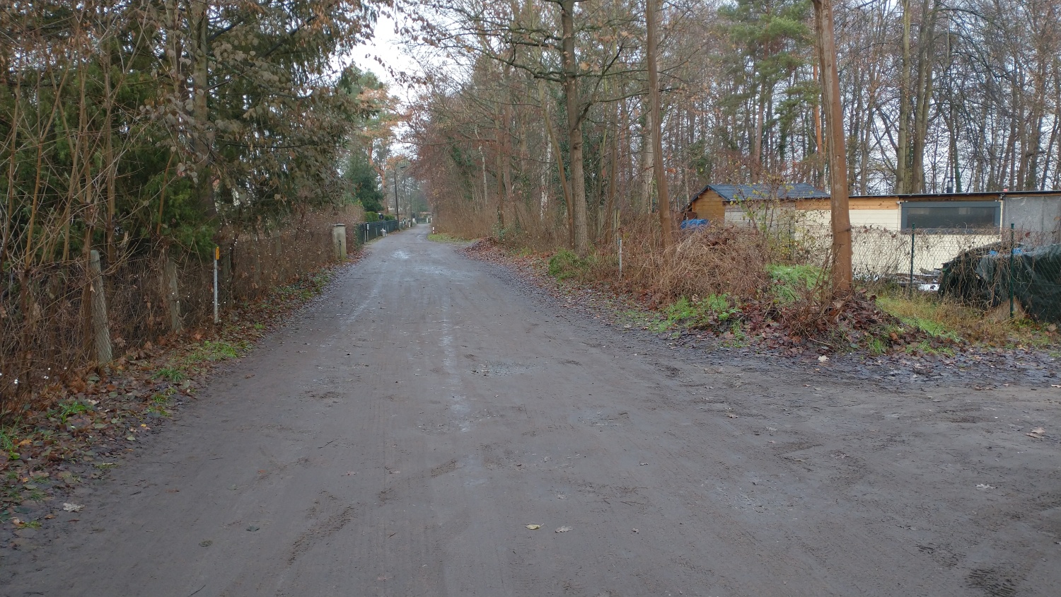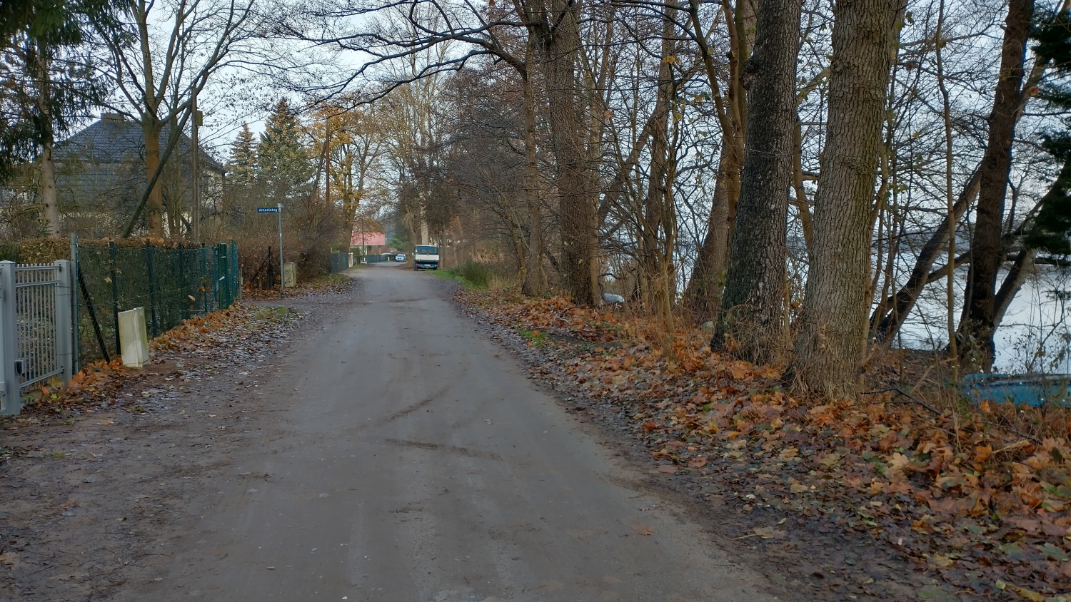 Als Beispiel für eine Pflasterung wird hier die Karl-Marx-Straße in Bestensee gezeigt (Verlängerung der Straße am Todnitzsee bis zum Sportplatz in Bestensee) mit Betonsteinen und einer Breite von 3 m.